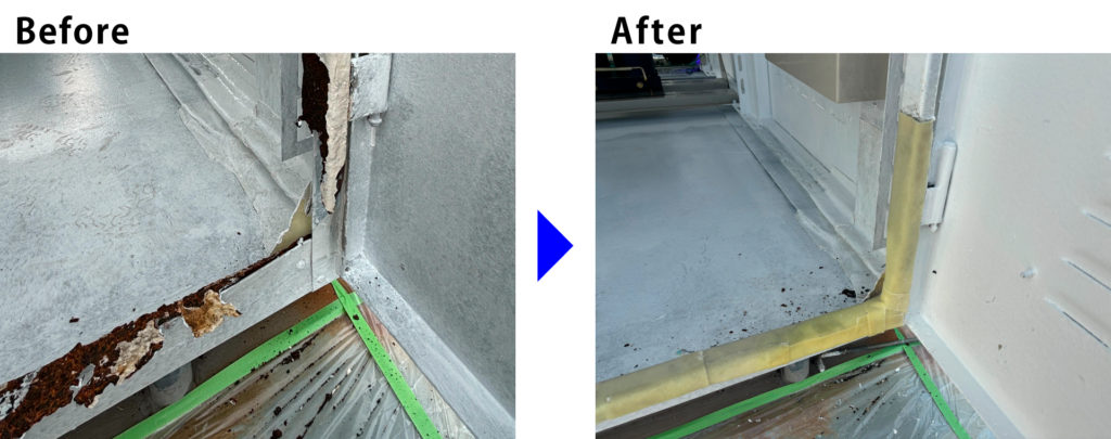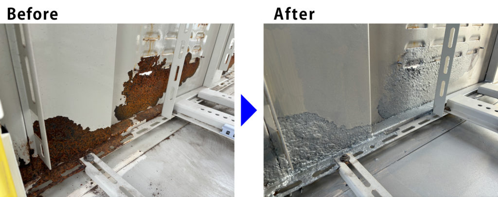 キュービクル内外で発生したサビによって腐食した箇所を修繕したうえで、サビ転換処理および防錆処理を施しました。