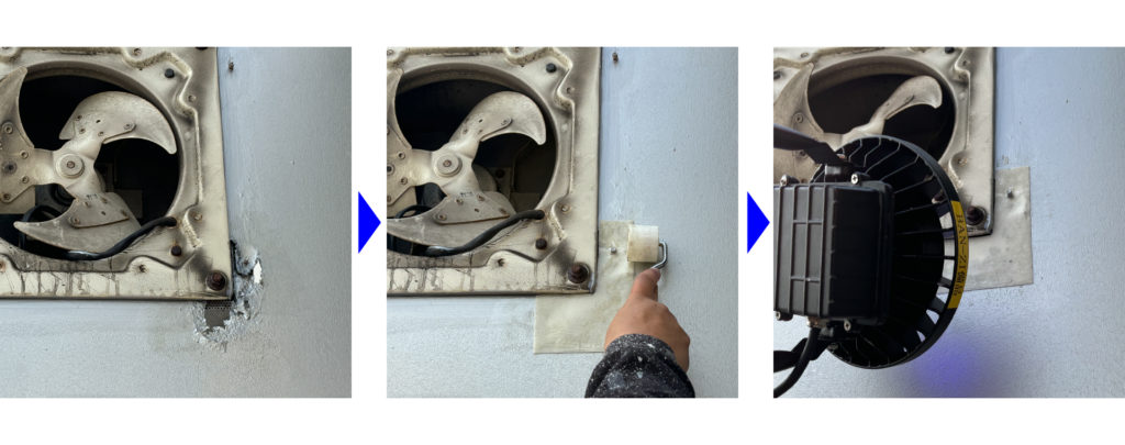 サビの浸食によって腐食した部分にBAN-ZI AID専用プライマーを塗布後、BAN-ZI AIDを貼り、紫外線照射機で硬化させる
