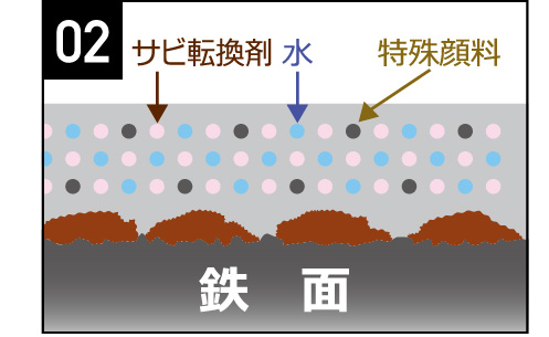 サビ転換剤と水がサビと反応して赤サビが黒サビへと変換、サビの進行を止めます。